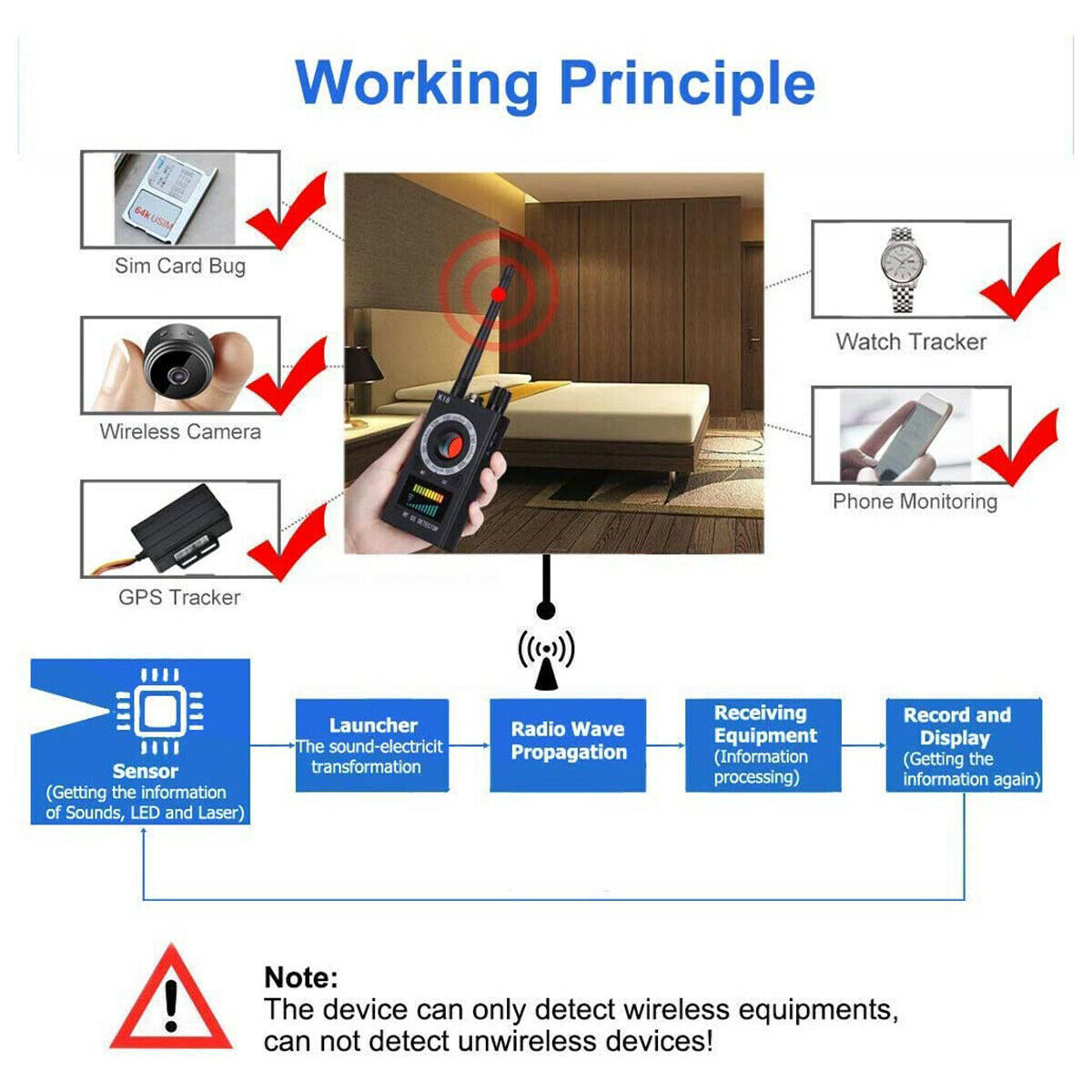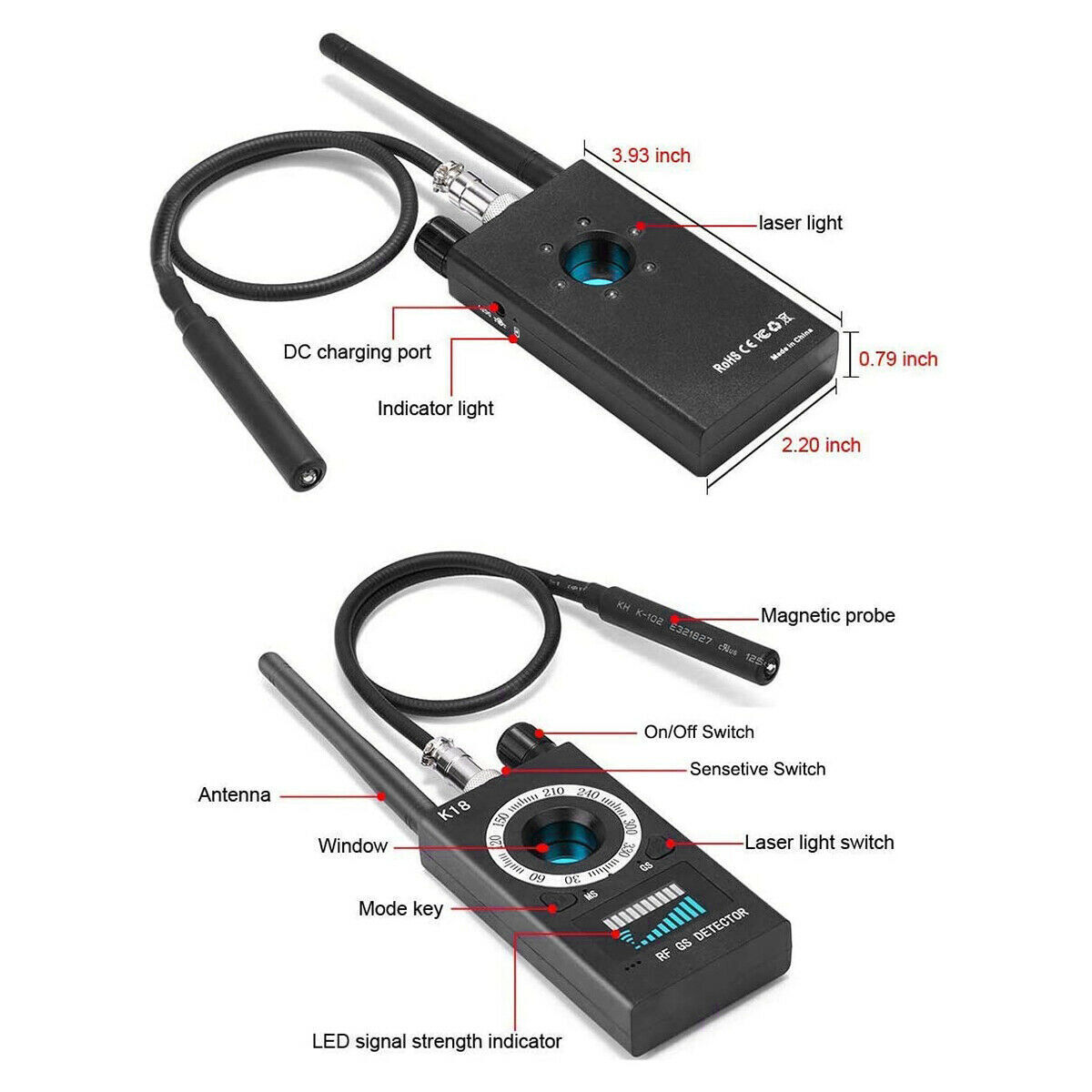 The K18 detector adopts German advanced technology, and is designed for the market of all kinds of bugs, car trackers, mobile phone undercover software, wireless pinhole cameras, surveillance cameras, casino fraud devices and other products, targeted development of security and prevention instruments.