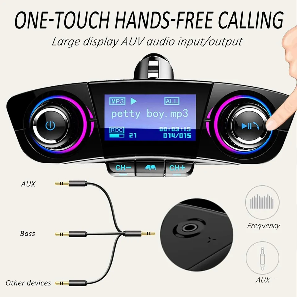 Bluetooth FM Transmitter Car MP3 Player Hands-Free Car Kit Wireless Radio Audio Adapter with Dual USB 5V 2.1A USB Port, U Disk, TF Card, Folder Playback, AUX Input Output, Voice Navigation, Memory Card Not Included